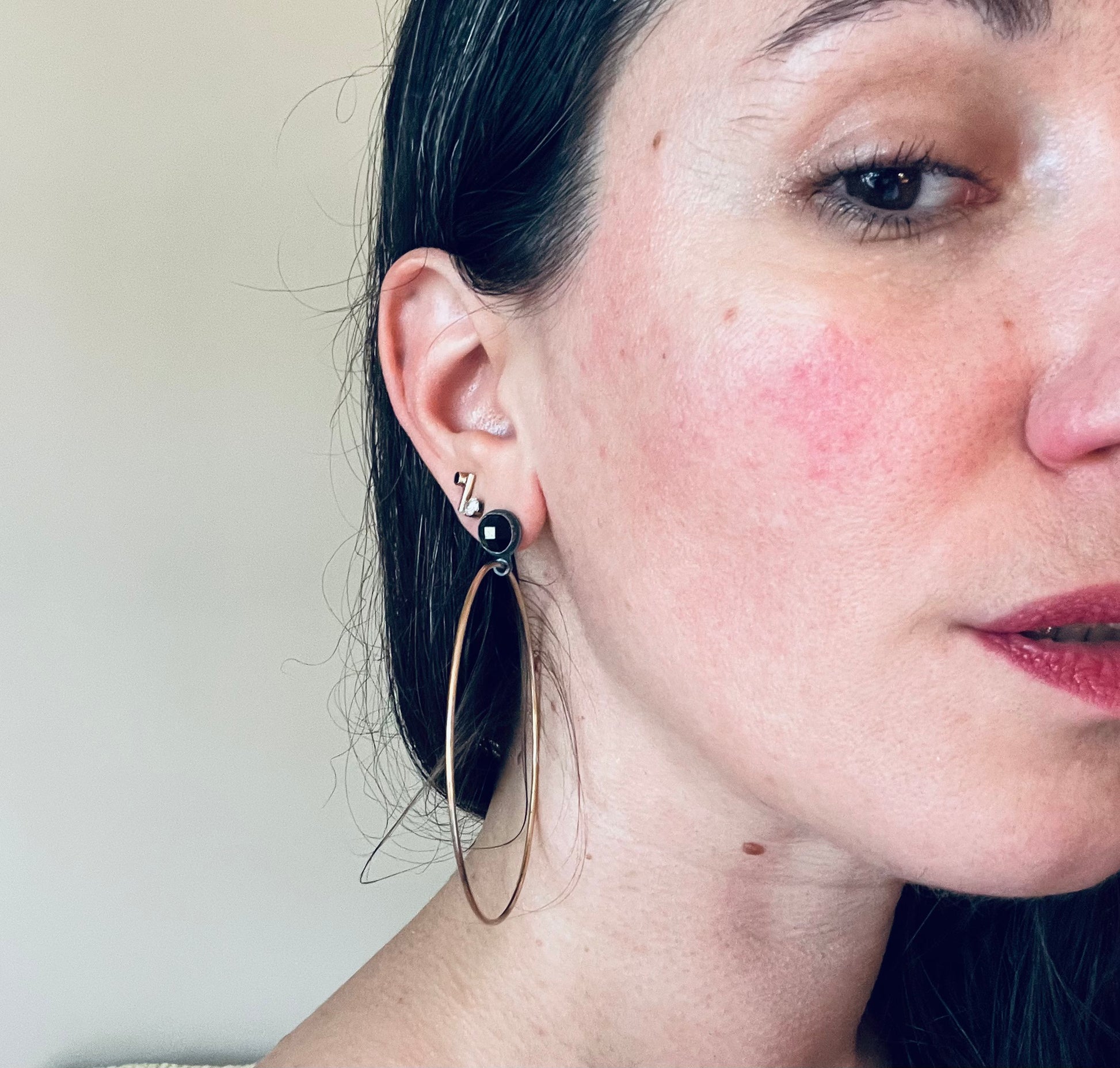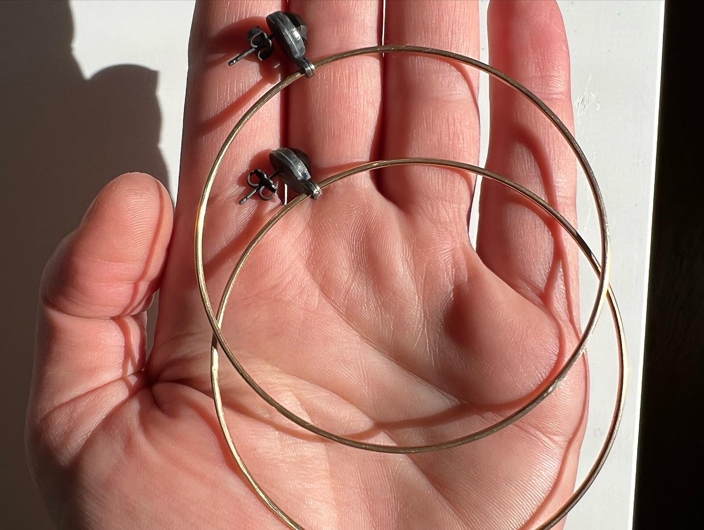 Black and gold hoop earrings are comprised of 10k gold hoops that are suspended from rose cut onyx that is set in an oxidized sterling silver, post back earring. These handmade earrings have a 70mm gold hoop.