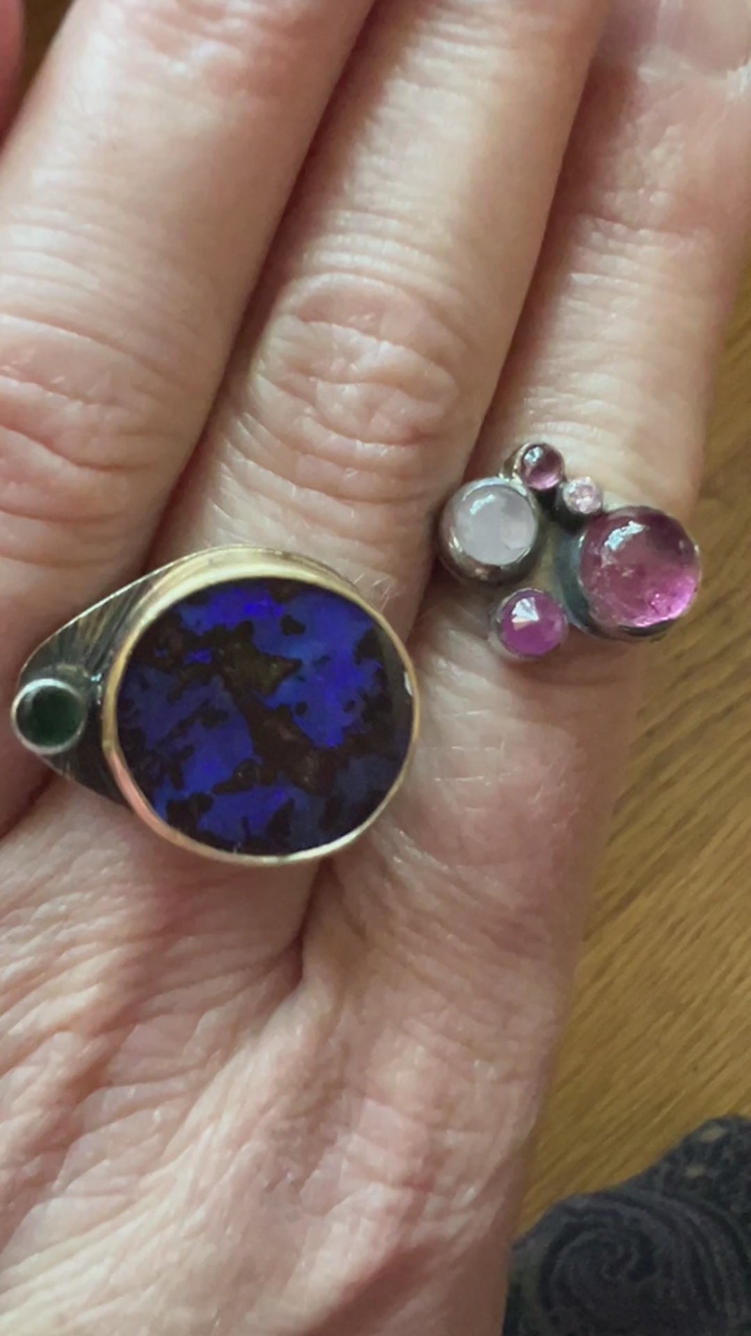 Handmade and one of a kind gemstone cluster ring in sterling silver includes tourmaline, rose quartz and sapphires all handset. Ring is an amazing array of pink gems and really sparkles.