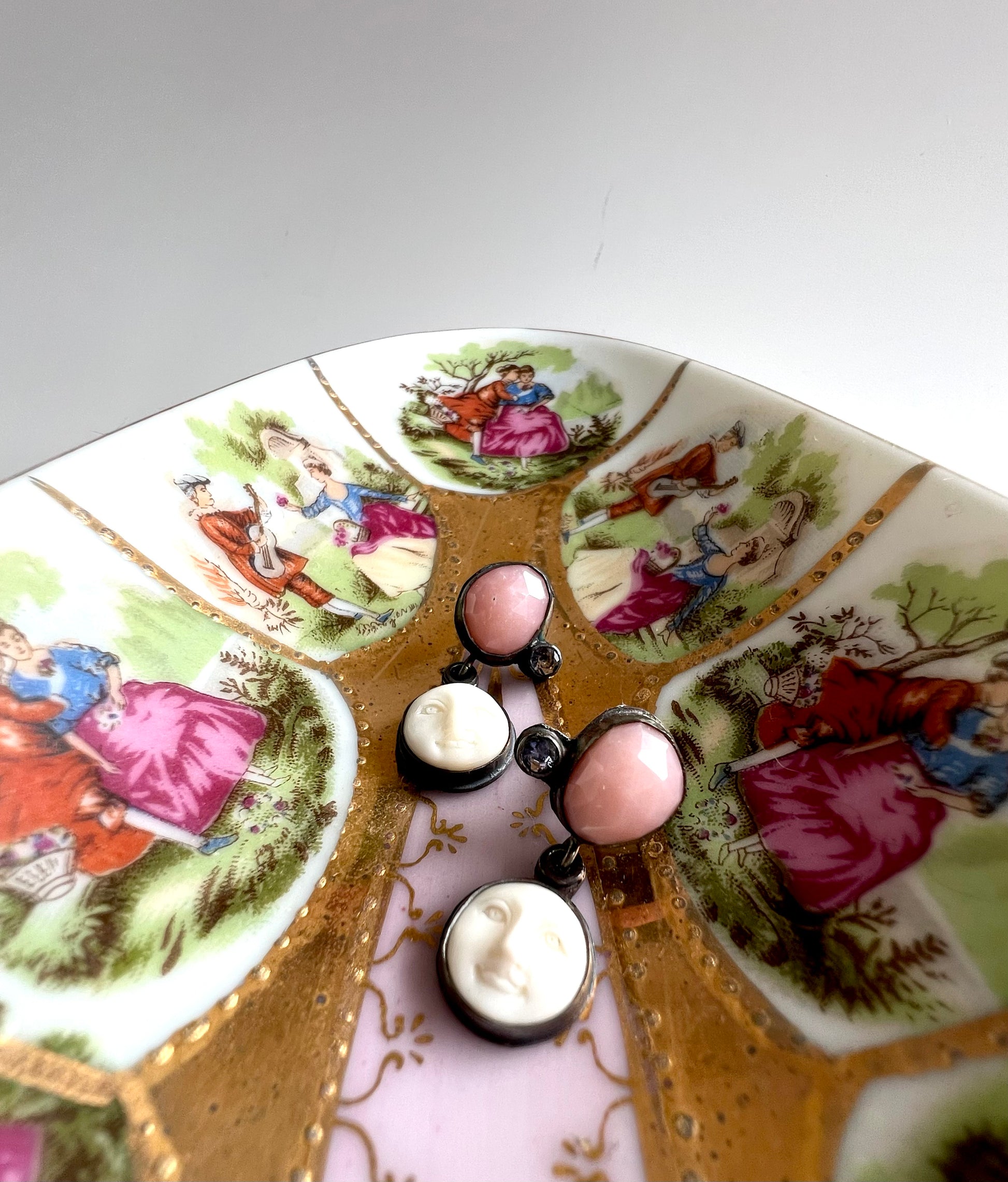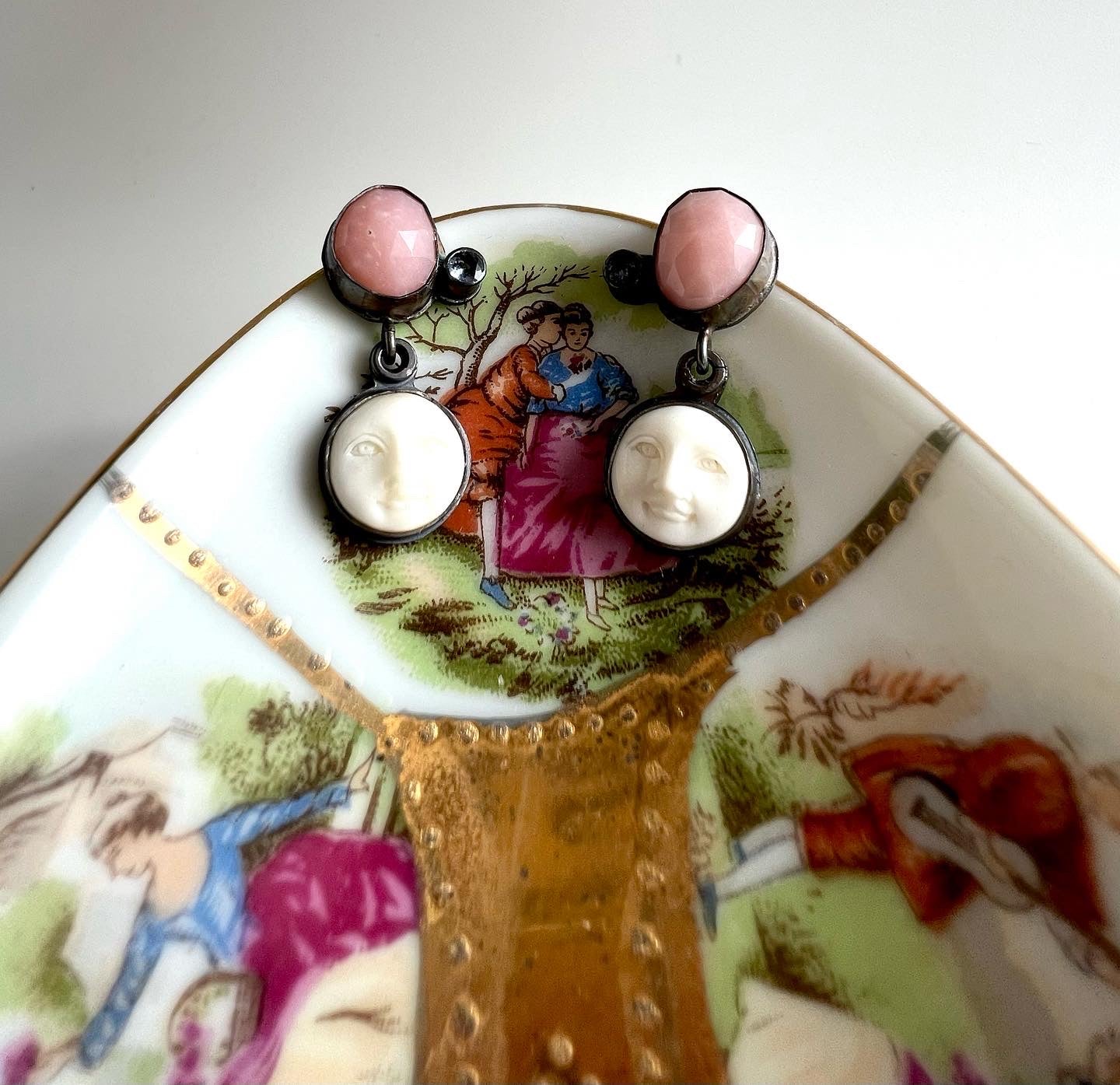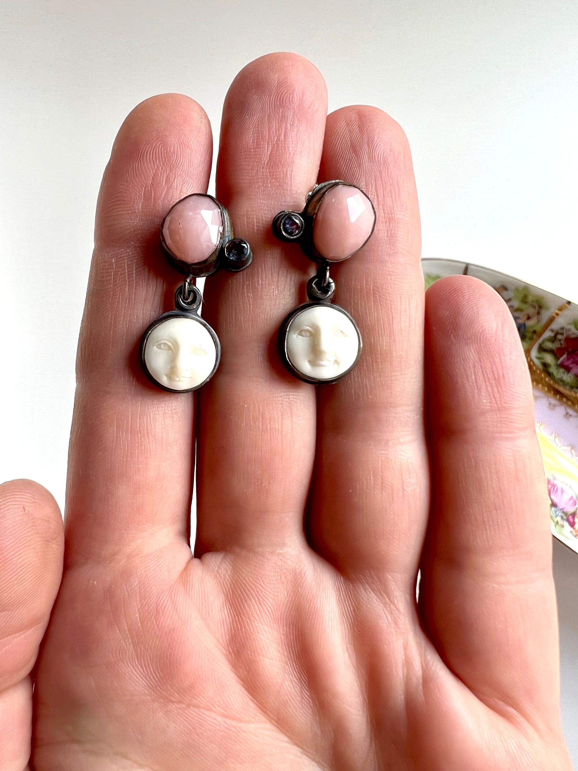moon face earrings - carved bone, pink opal and tanzanite post earrings - handmade and one of a kind jewelry
