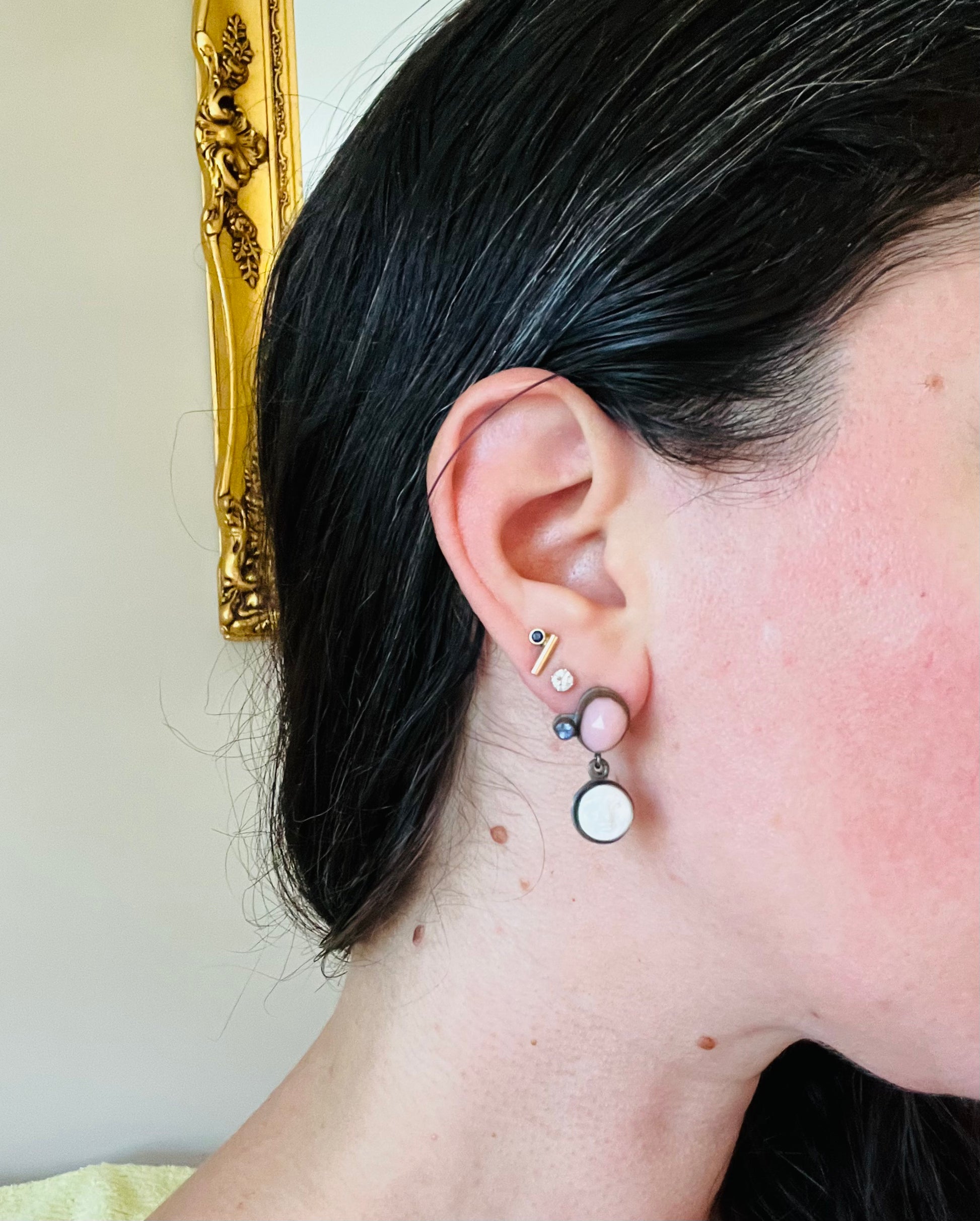 One of a kind moon face earrings. Rose cut pink opal, tanzanite, and little carved bone face set in sterling silver. Post back with a butterfly nut closure. Handmade and one of a kind.