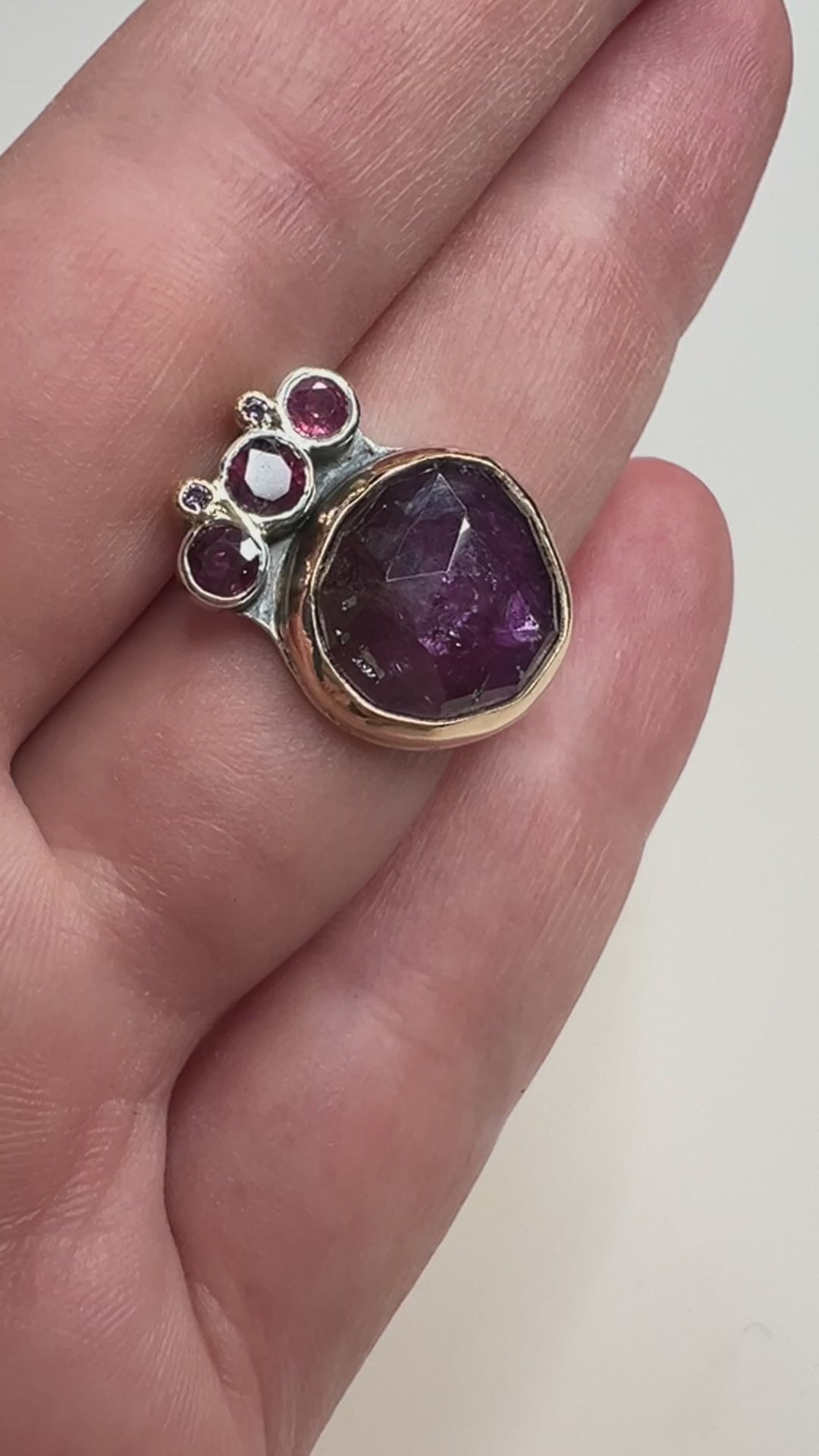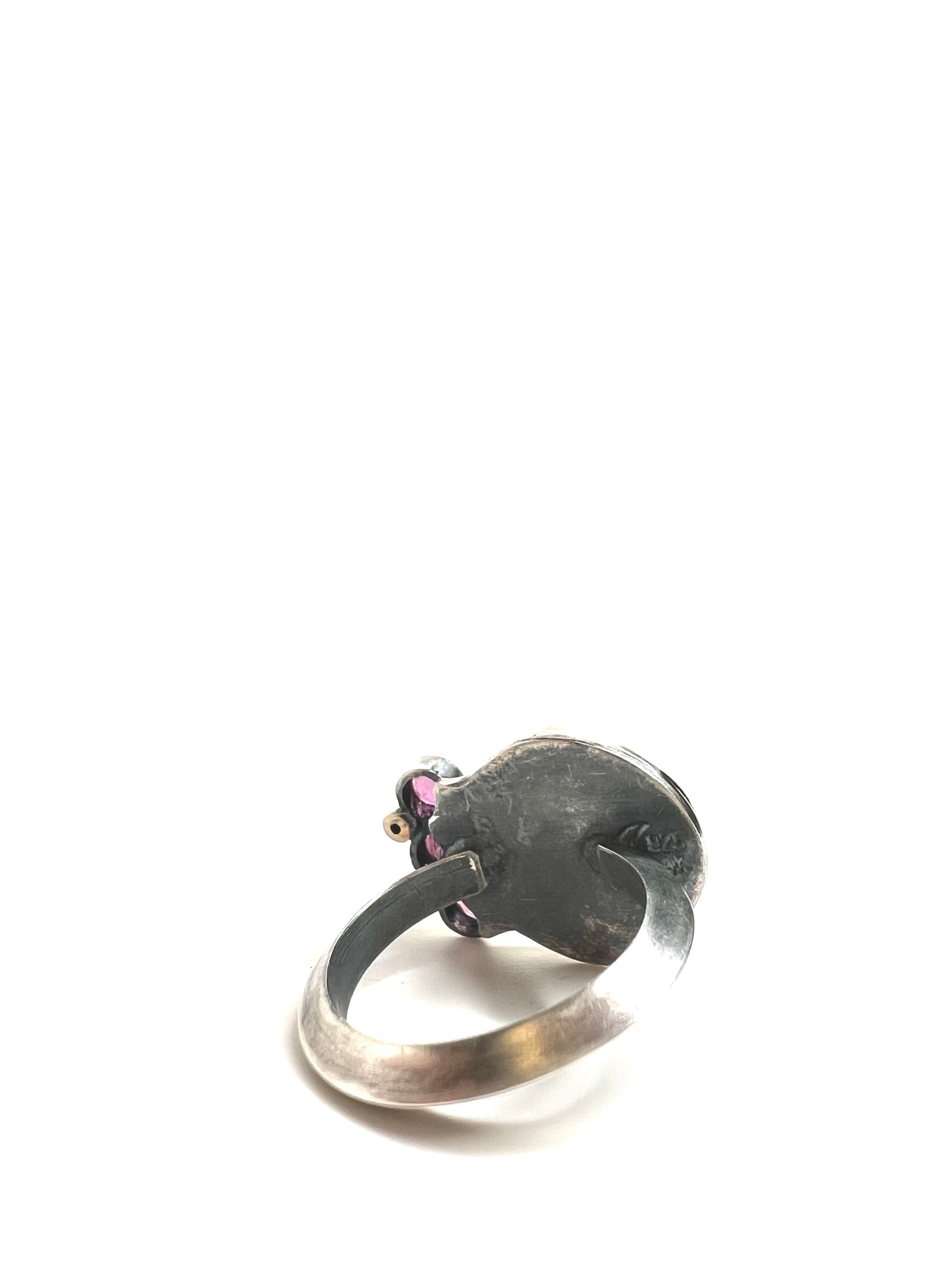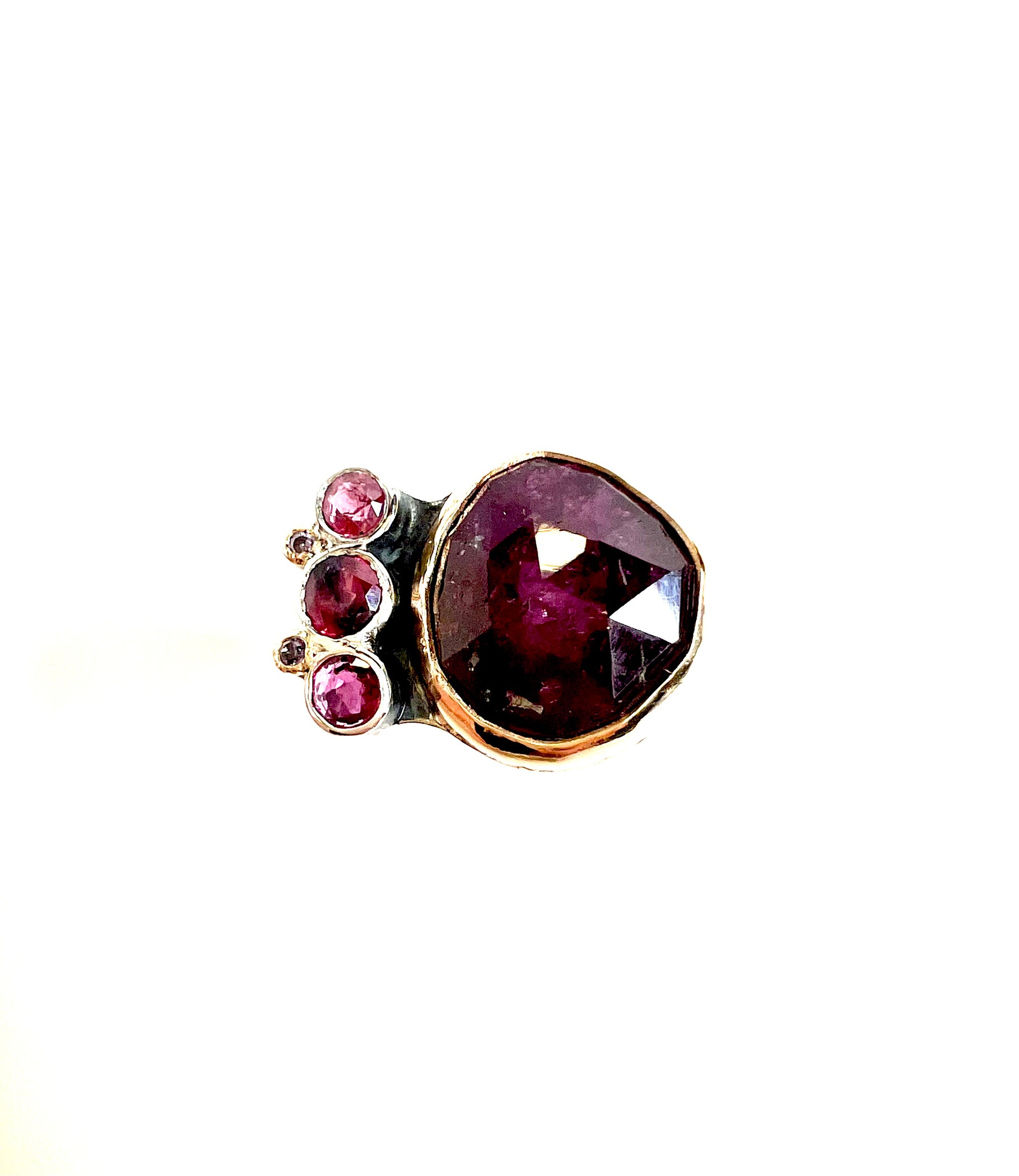 Tourmaline and sapphire beauty ring. Center rose cut tourmaline wrapped in 14k gold set next to another tourmaline and four sapphires, two of which are set in 14k gold tubes. Ring has been oxidized to achieve color.
