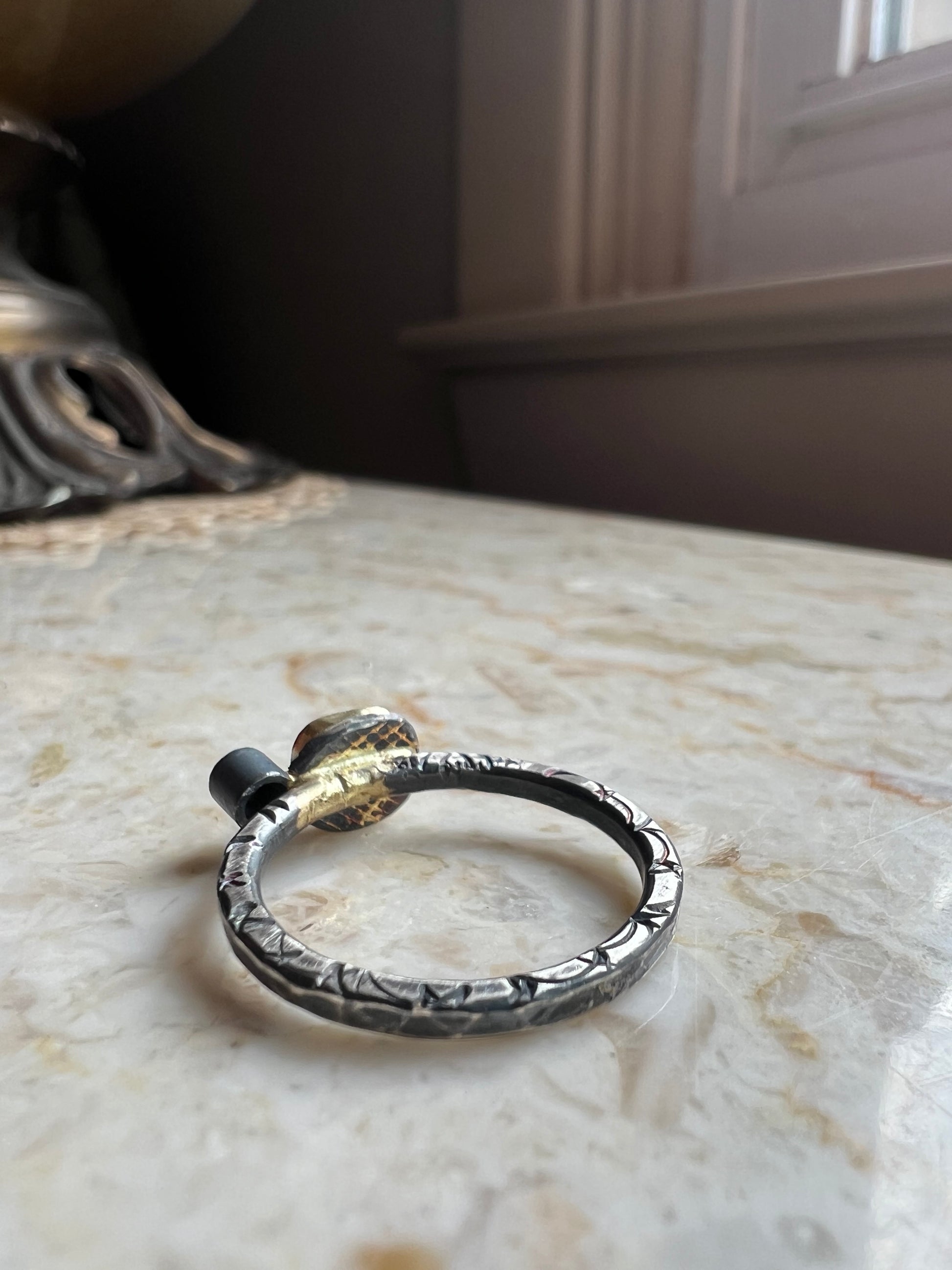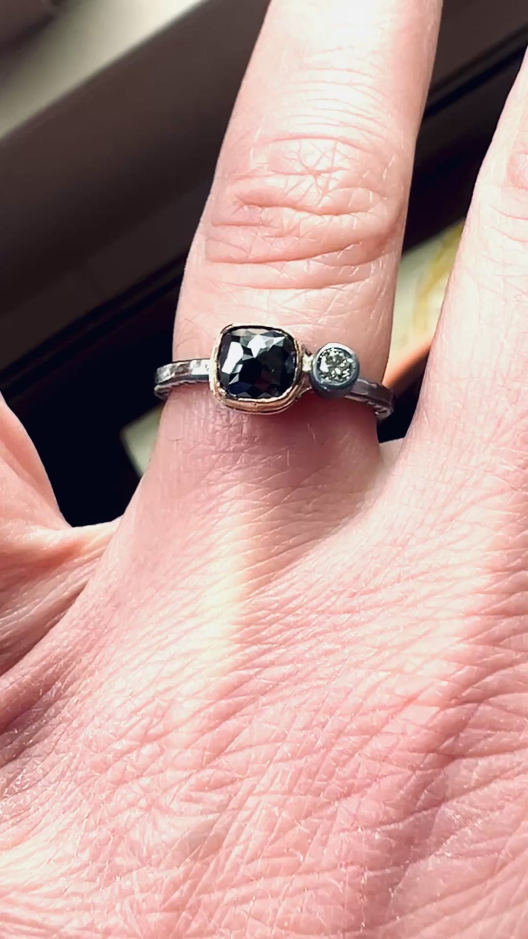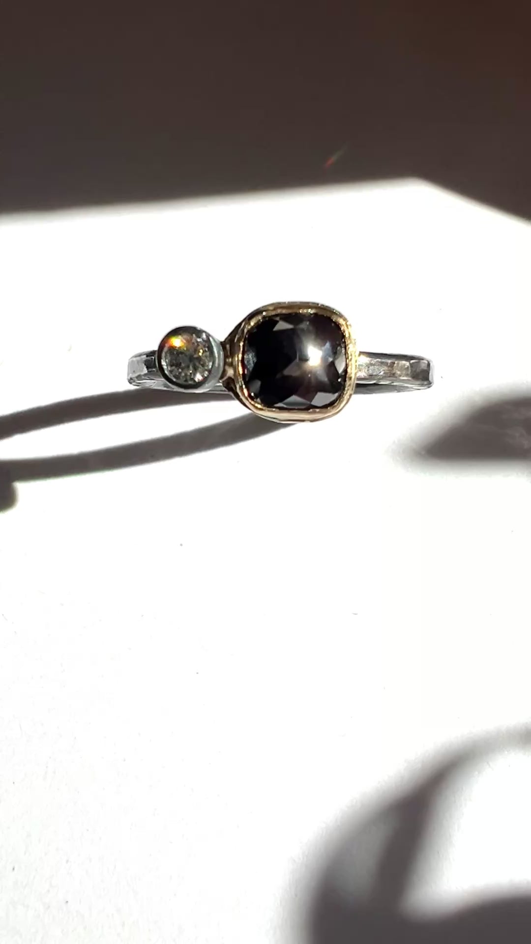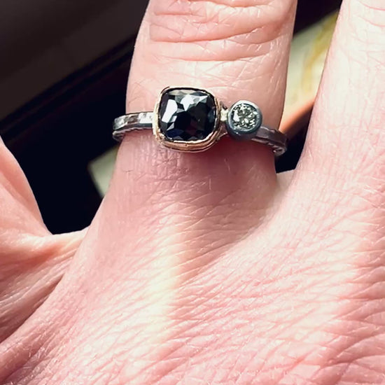 One of a kind and handmade rose cut black diamond with grey diamond ring. Black diamond has a lovely rose cut and is set in 14k gold and set next to a brilliant cut steel grey diamond. Ring has stamped and hammer texture on the ring band and the ring is oxidized to achieve the dark color.